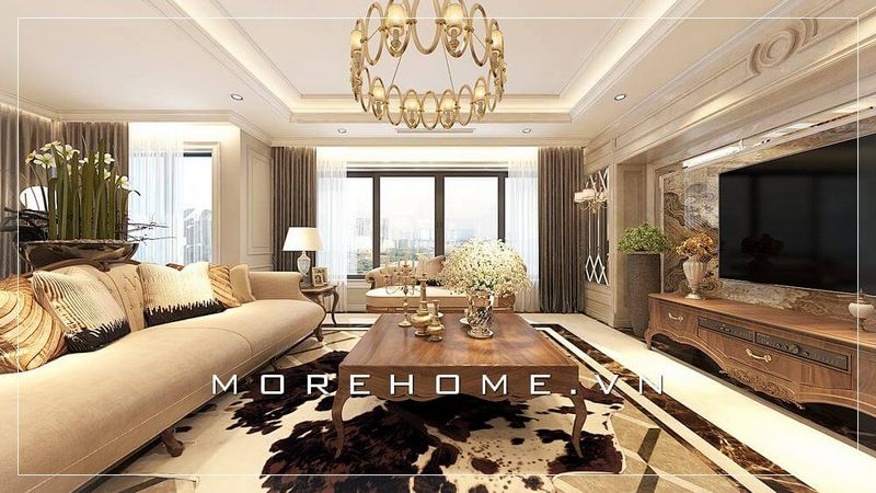 Để có một không gian biệt thự thật đẹp, cần phải chú ý đến các món đồ trang trí như thảm, gối ôm trên ghế sofa, tranh treo tường và đèn chùm.