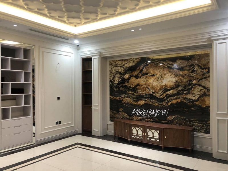 Bức vách ốp tivi bằng đá granite đen cao cấp có hoa văn sóng lửa cực ấn tượng, mang lại năng lượng mạnh mẽ cho không gian phòng khách
