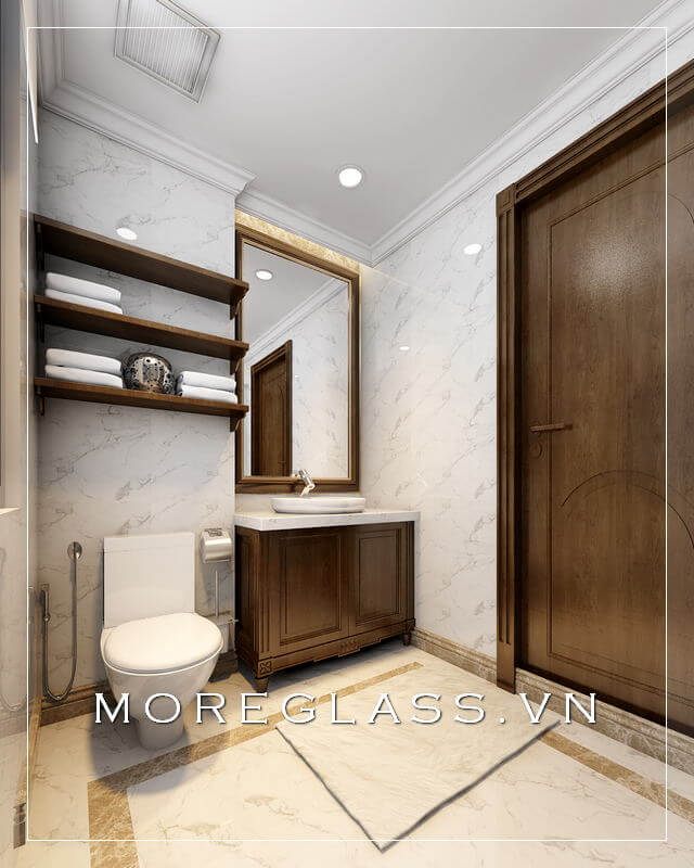 Mẫu nhà vệ sinh đẹp được trang trí bằng kệ tủ gỗ tự nhiên màu nâu óc chó, tạo nên sự sang trọng và nổi bật trên nền gạch ốp lát màu trắng vân cao cấp.